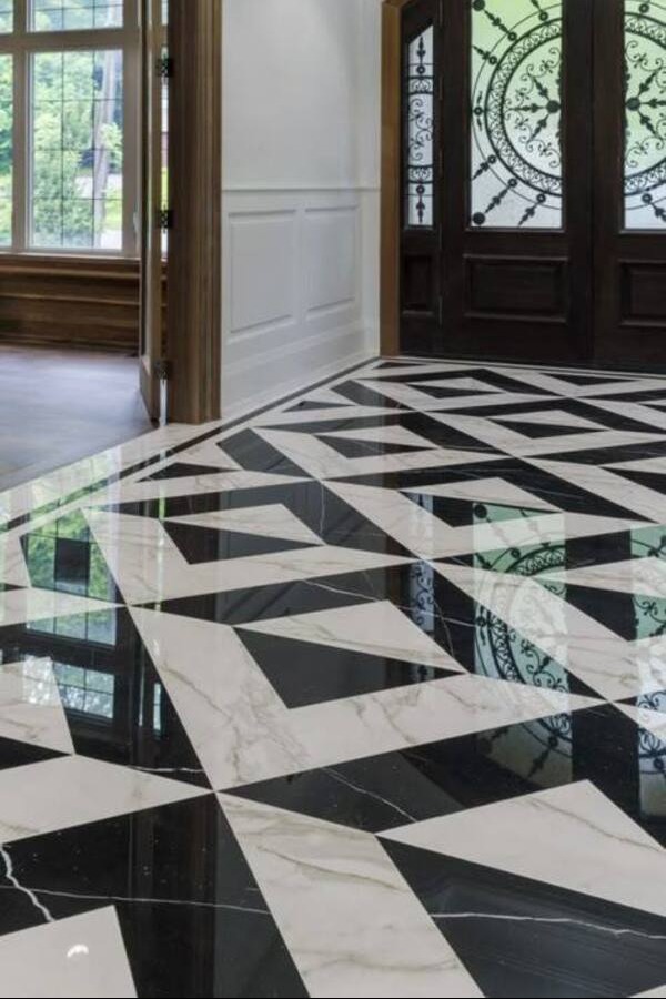 Geometric marble inlay flooring, like the bold black and white pattern displayed, offers a modern yet classic aesthetic. The contrast of light and dark natural marble creates depth, symmetry, and a visually captivating effect. Such designs are ideal for: